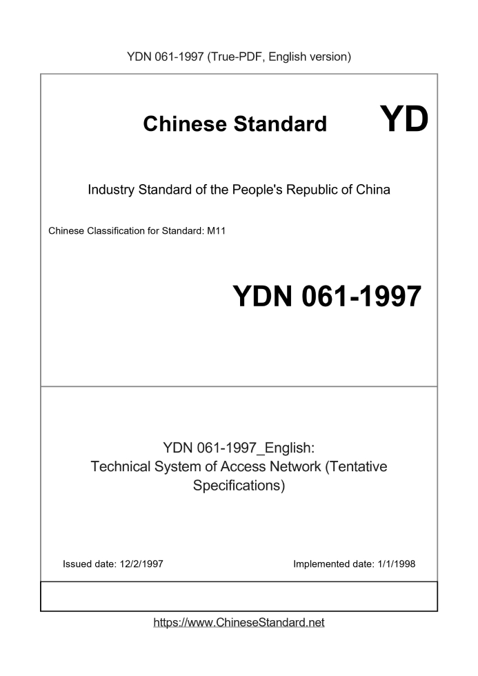 Delivery: <= 13 days. True-PDF full-copy in English will be manually translated and delivered via email. YDN061-1997: Technical System of Access Network (Tentative Specifications)