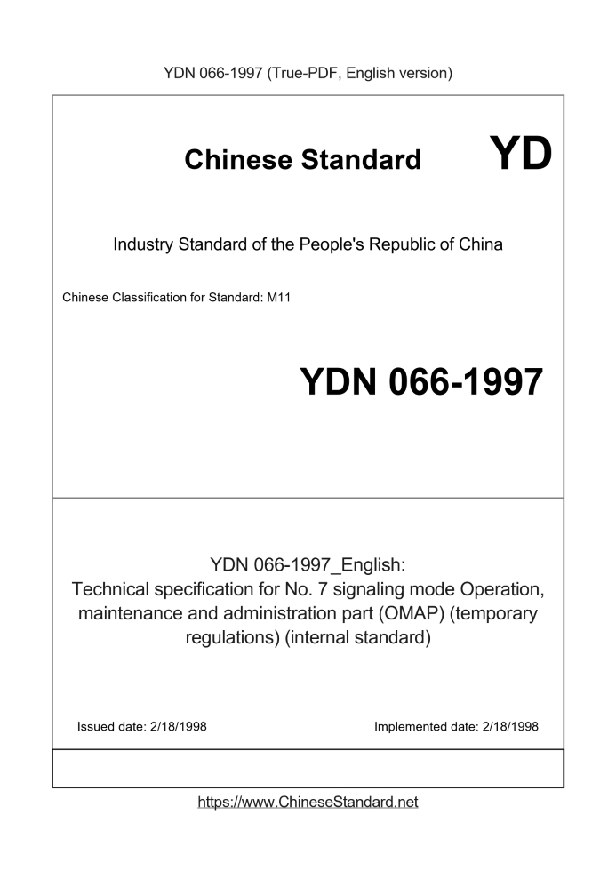 Delivery: <= 10 days. True-PDF full-copy in English will be manually translated and delivered via email. YDN066-1997: Technical specification for No. 7 signaling mode Operation, maintenance and administration part (OMAP) (temporary regulations) (internal standard)