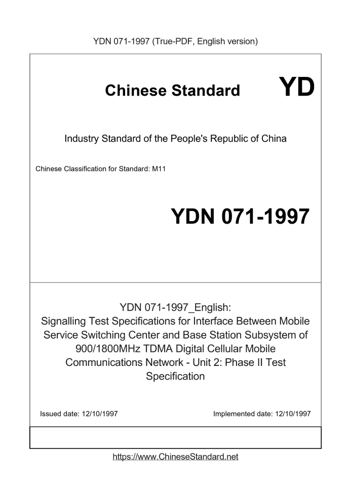 Delivery: <= 4 days. True-PDF full-copy in English will be manually translated and delivered via email. YDN071-1997: Signalling Test Specifications for Interface Between Mobile Service Switching Center and Base Station Subsystem of 900/1800MHz TDMA Digital Cellular Mobile Communications Network - Unit 2: Phase II Test Specification