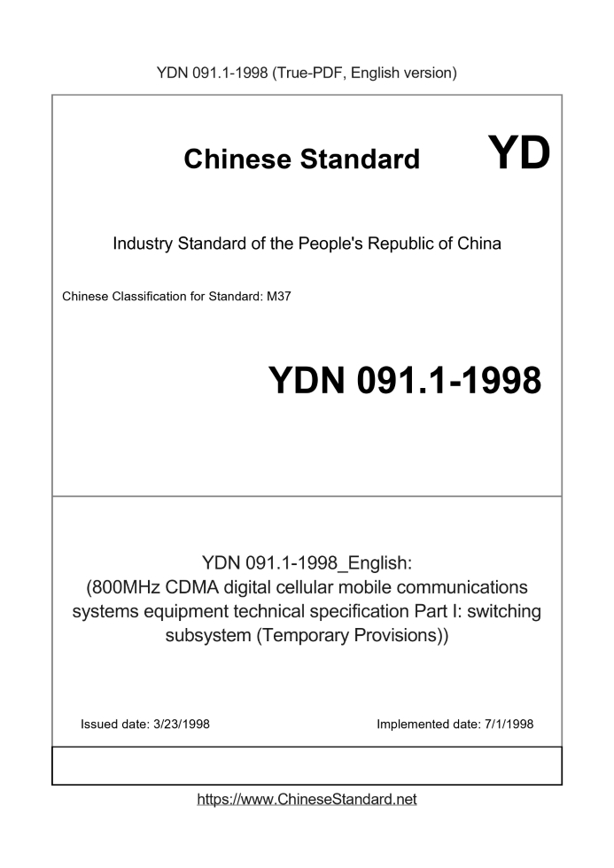 Basic dataStandard ID: YDN 091.1-1998 (YDN091.1-1998)Description (Translated English): (800MHz CDMA digital cellular mobile communications systems equipment technical specification Part I: switching subsystem (Temporary Provisions)) Sector / Industry: Telecommunication Industry Standard Classification of Chinese Standard: M37 Word Count Estimation: 63,682 Date of Issue: 3/23/1998 Date of Implementation: 7/1/1998 Adopted Standard: CDMA, NEQ; ITU, NEQ Regulation (derived from): Ministry of Industry and Information Technology Notice 2013 No. 37 Tips & Frequently Asked Questions:Question 1: How long will the true-PDF of YDN091.1-1998_English be delivered?Answer: Upon your order, we will start to translate YDN091.1-1998_English as soon as possible, and keep you informed of the progress. The lead time is typically 7 ~ 11 working days. The lengthier the document the longer the lead time.Question 2: Can I share the purchased PDF of YDN091.1-1998_English with my colleagues?Answer: Yes. The purchased PDF of YDN091.1-1998_English will be deemed to be sold to your employer/organization who actually pays for it, including your colleagues and your employer's intranet.Question 3: Does the price include tax/VAT?Answer: Yes. Our tax invoice, downloaded/delivered in 9 seconds, includes all tax/VAT and complies with 100+ countries' tax regulations (tax exempted in 100+ countries) -- See Avoidance of Double Taxation Agreements (DTAs): List of DTAs signed between Singapore and 100+ countriesQuestion 4: Do you accept my currency other than USD?Answer: Yes. If you need your currency to be printed on the invoice, please write an email to Sales@ChineseStandard.net. In 2 working-hours, we will create a special link for you to pay in any currencies. Otherwise, follow the normal steps: Add to Cart -- Checkout -- Select your currency to pay. |
