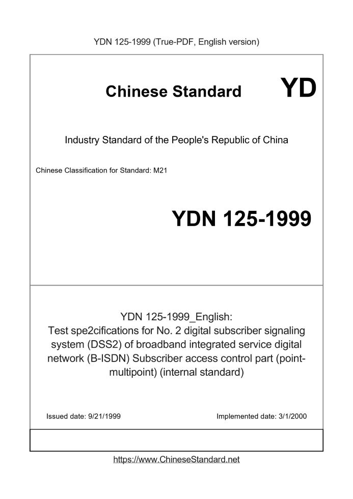 Basic dataStandard ID: YDN 125-1999 (YDN125-1999)Description (Translated English): Test spe2cifications for No. 2 digital subscriber signaling system (DSS2) of broadband integrated service digital network (B-ISDN) Subscriber access control part (point-multipoint) (internal standard) Sector / Industry: Telecommunication Industry Standard Classification of Chinese Standard: M21 Word Count Estimation: 352,387 Date of Issue: 9/21/1999 Date of Implementation: 3/1/2000 Regulation (derived from): MIIT Notice 2011 No. 8 Tips & Frequently Asked Questions:Question 1: How long will the true-PDF of YDN125-1999_English be delivered?Answer: Upon your order, we will start to translate YDN125-1999_English as soon as possible, and keep you informed of the progress. The lead time is typically 1 ~ 3 working days. The lengthier the document the longer the lead time.Question 2: Can I share the purchased PDF of YDN125-1999_English with my colleagues?Answer: Yes. The purchased PDF of YDN125-1999_English will be deemed to be sold to your employer/organization who actually pays for it, including your colleagues and your employer's intranet.Question 3: Does the price include tax/VAT?Answer: Yes. Our tax invoice, downloaded/delivered in 9 seconds, includes all tax/VAT and complies with 100+ countries' tax regulations (tax exempted in 100+ countries) -- See Avoidance of Double Taxation Agreements (DTAs): List of DTAs signed between Singapore and 100+ countriesQuestion 4: Do you accept my currency other than USD?Answer: Yes. If you need your currency to be printed on the invoice, please write an email to Sales@ChineseStandard.net. In 2 working-hours, we will create a special link for you to pay in any currencies. Otherwise, follow the normal steps: Add to Cart -- Checkout -- Select your currency to pay. |