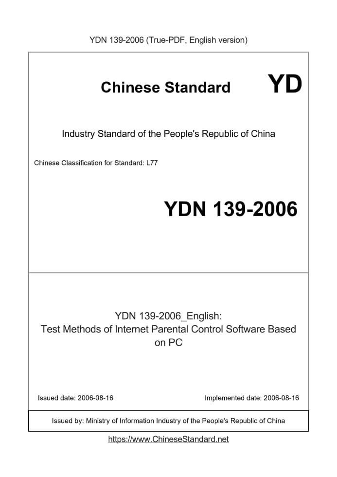 Delivery: <= 8 days. True-PDF full-copy in English will be manually translated and delivered via email. YDN139-2006: Test Methods of Internet Parental Control Software Based on PC Status: Valid