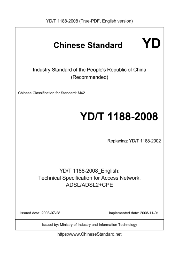 Delivery: <= 3 days. True-PDF full-copy in English will be manually translated and delivered via email. YD/T 1188-2008: Technical Specification for Access Network. ADSL/ADSL2+CPE Status: Valid YD/T 1188: Historical versions