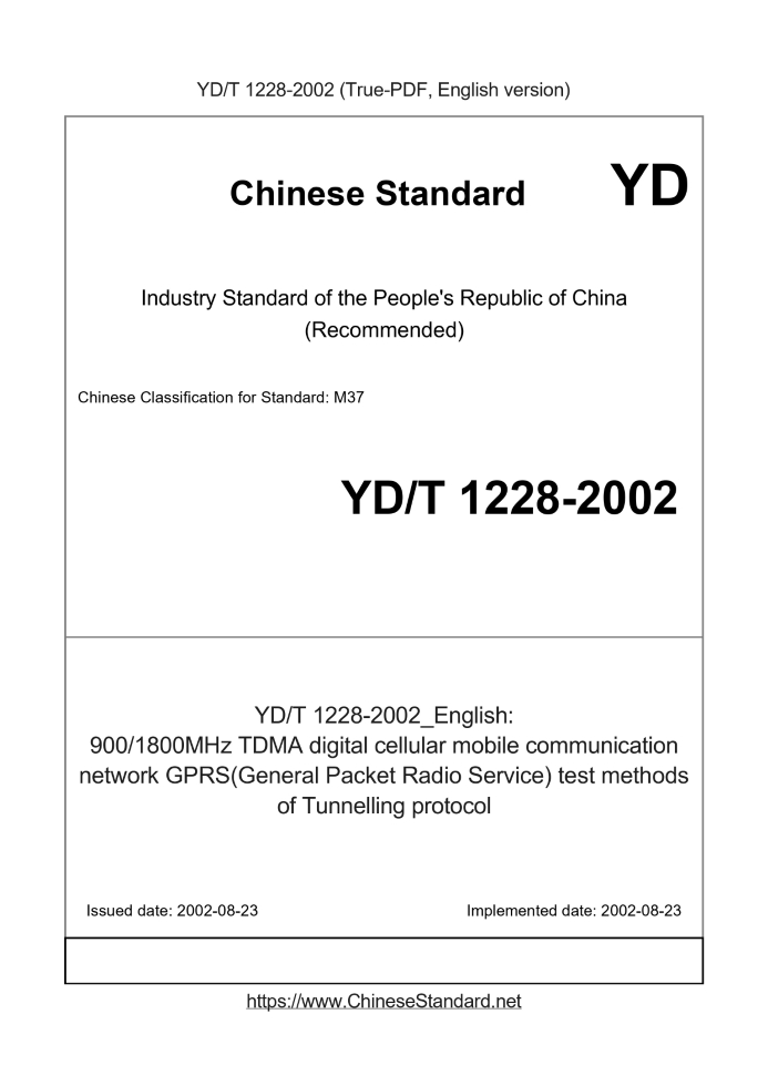 Delivery: <= 7 days. True-PDF full-copy in English will be manually translated and delivered via email. YD/T 1228-2002: 900/1800MHz TDMA digital cellular mobile communication network GPRS(General Packet Radio Service) test methods of Tunnelling protocol Status: Valid