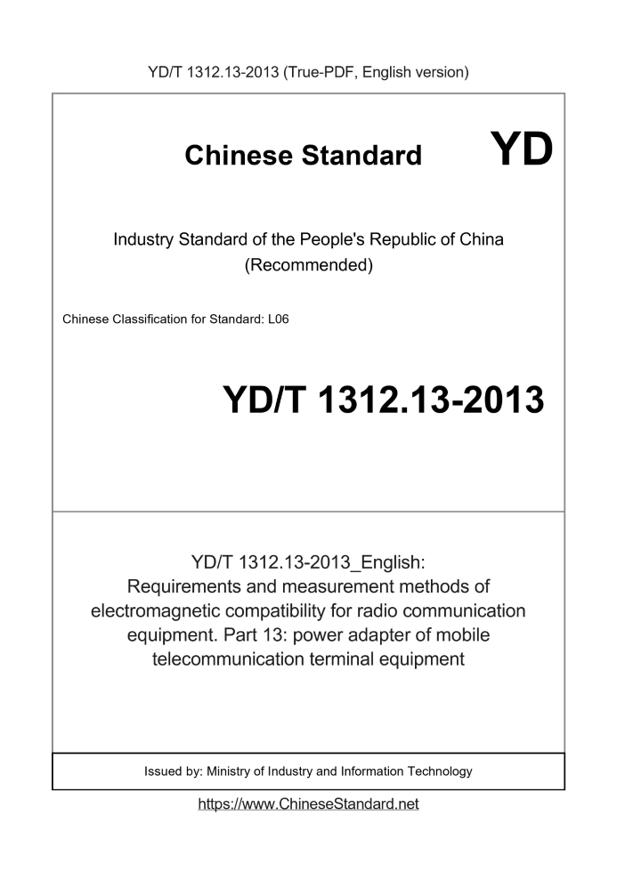 Delivery: <= 3 days. True-PDF full-copy in English will be manually translated and delivered via email. YD/T 1312.13-2013: Requirements and measurement methods of electromagnetic compatibility for radio communication equipment. Part 13: power adapter of mobile telecommunication terminal equipment Status: Valid