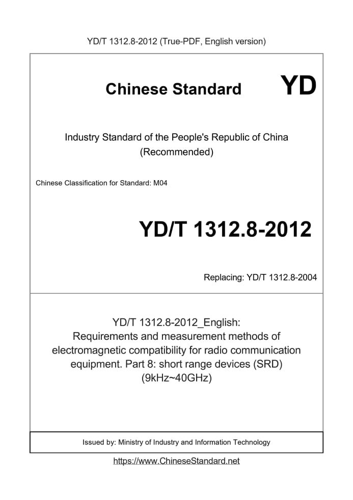 Delivery: <= 5 days. True-PDF full-copy in English will be manually translated and delivered via email. YD/T 1312.8-2012: Requirements and measurement methods of electromagnetic compatibility for radio communication equipment. Part 8: short range devices (SRD) (9kHz~40GHz) Status: Valid YD/T 1312.8: Historical versions