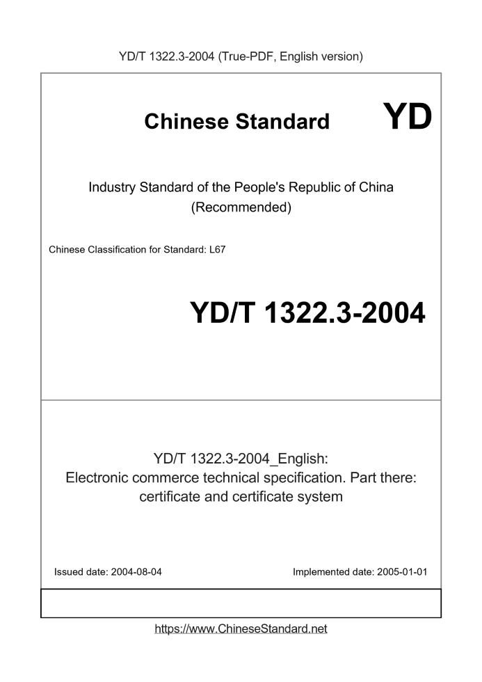Delivery: <= 10 days. True-PDF full-copy in English will be manually translated and delivered via email. YD/T 1322.3-2004: Electronic commerce technical specification. Part there: certificate and certificate system Status: Valid
