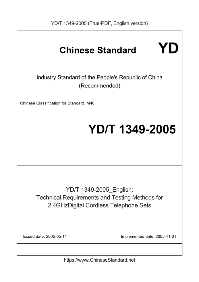 Delivery: <= 4 days. True-PDF full-copy in English will be manually translated and delivered via email. YD/T 1349-2005: Technical Requirements and Testing Methods for 2.4GHzDigital Cordless Telephone Sets Status: Valid