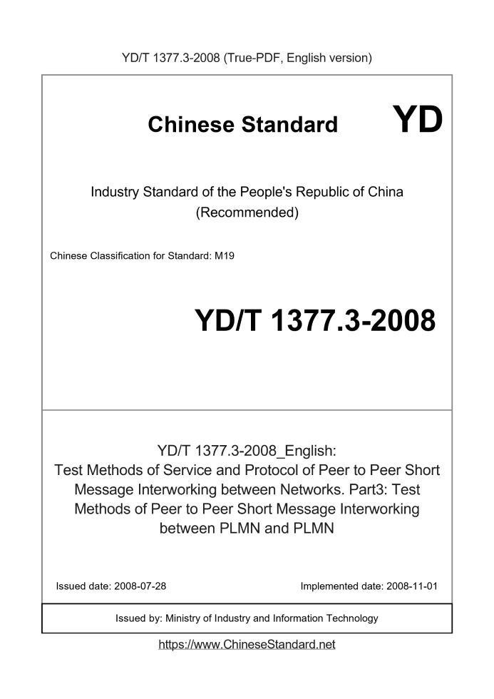Delivery: <= 4 days. True-PDF full-copy in English will be manually translated and delivered via email. YD/T 1377.3-2008: Test Methods of Service and Protocol of Peer to Peer Short Message Interworking between Networks. Part3: Test Methods of Peer to Peer Short Message Interworking between PLMN and PLMN Status: Valid