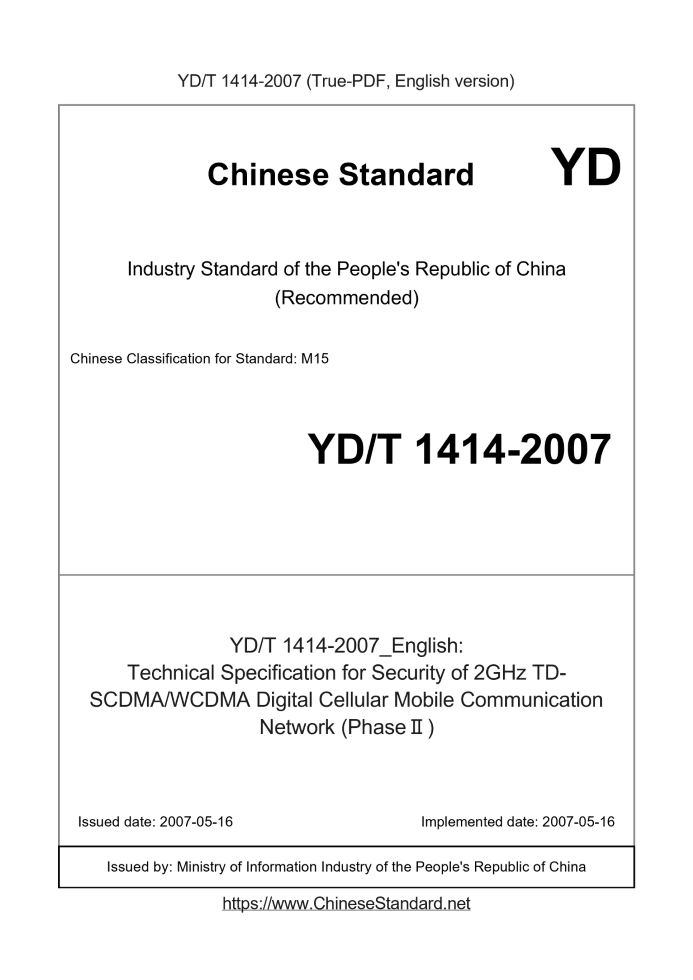 Delivery: <= 10 days. True-PDF full-copy in English will be manually translated and delivered via email. YD/T 1414-2007: Technical Specification for Security of 2GHz TD-SCDMA/WCDMA Digital Cellular Mobile Communication Network (PhaseⅡ)