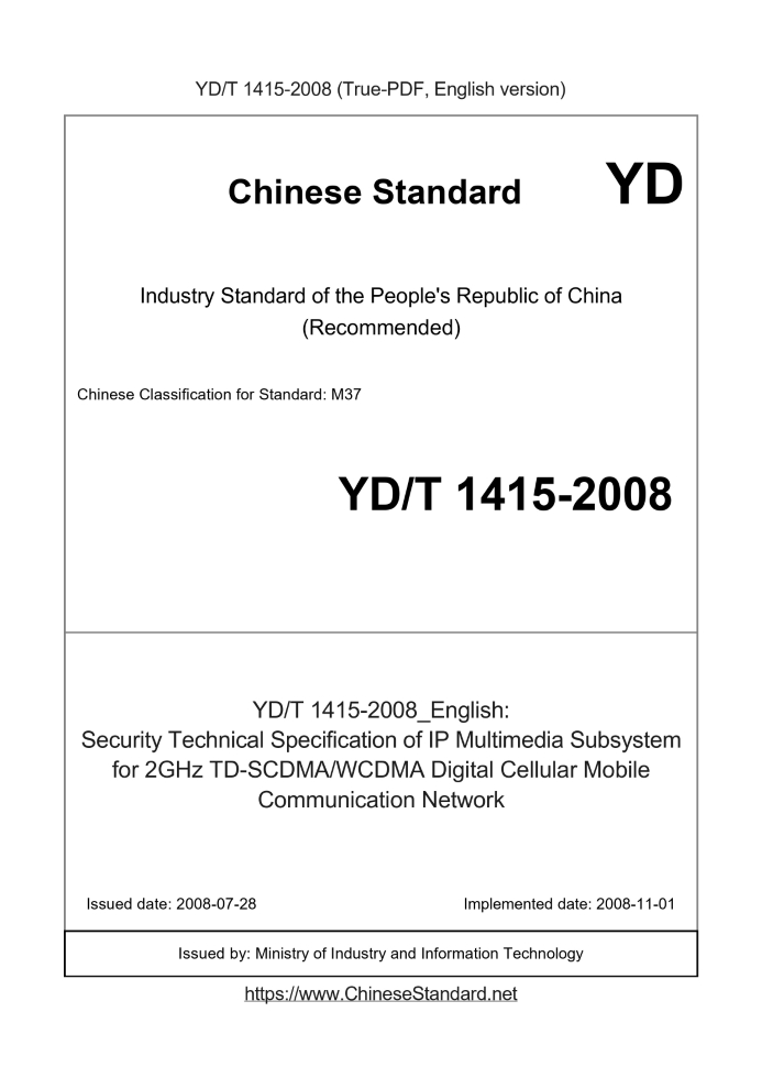 Delivery: <= 6 days. True-PDF full-copy in English will be manually translated and delivered via email. YD/T 1415-2008: Security Technical Specification of IP Multimedia Subsystem for 2GHz TD-SCDMA/WCDMA Digital Cellular Mobile Communication Network Status: Valid