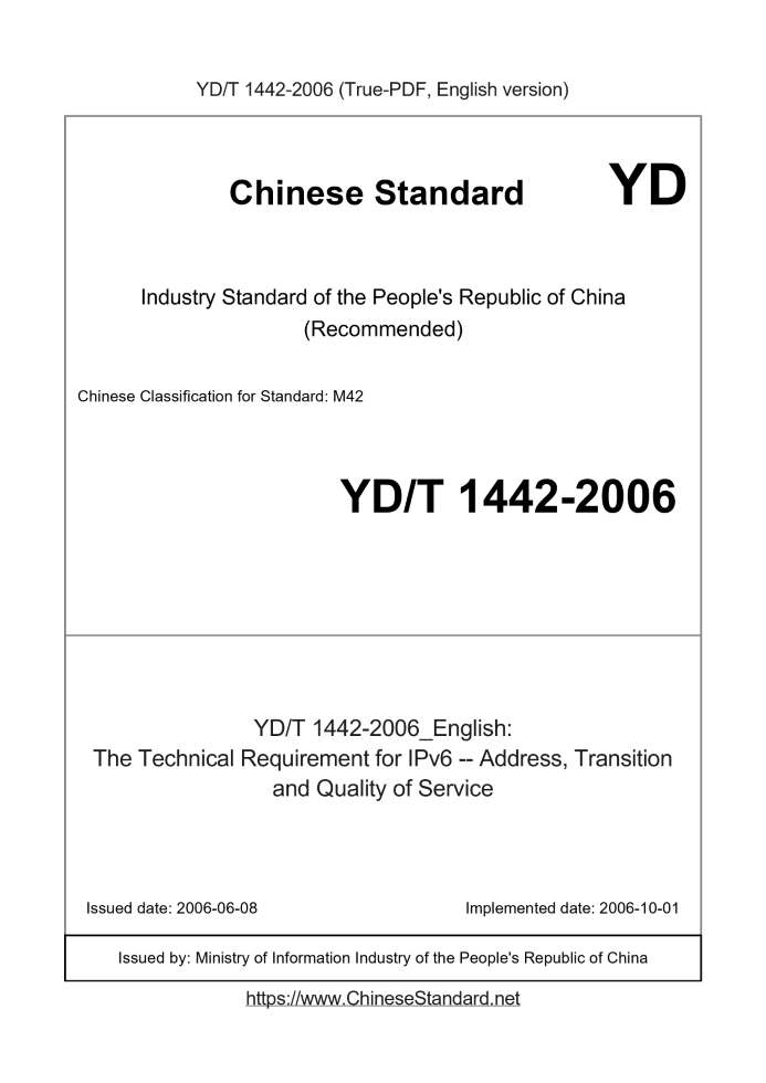 Delivery: <= 5 days. True-PDF full-copy in English will be manually translated and delivered via email. YD/T 1442-2006: The Technical Requirement for IPv6 -- Address, Transition and Quality of Service Status: Valid