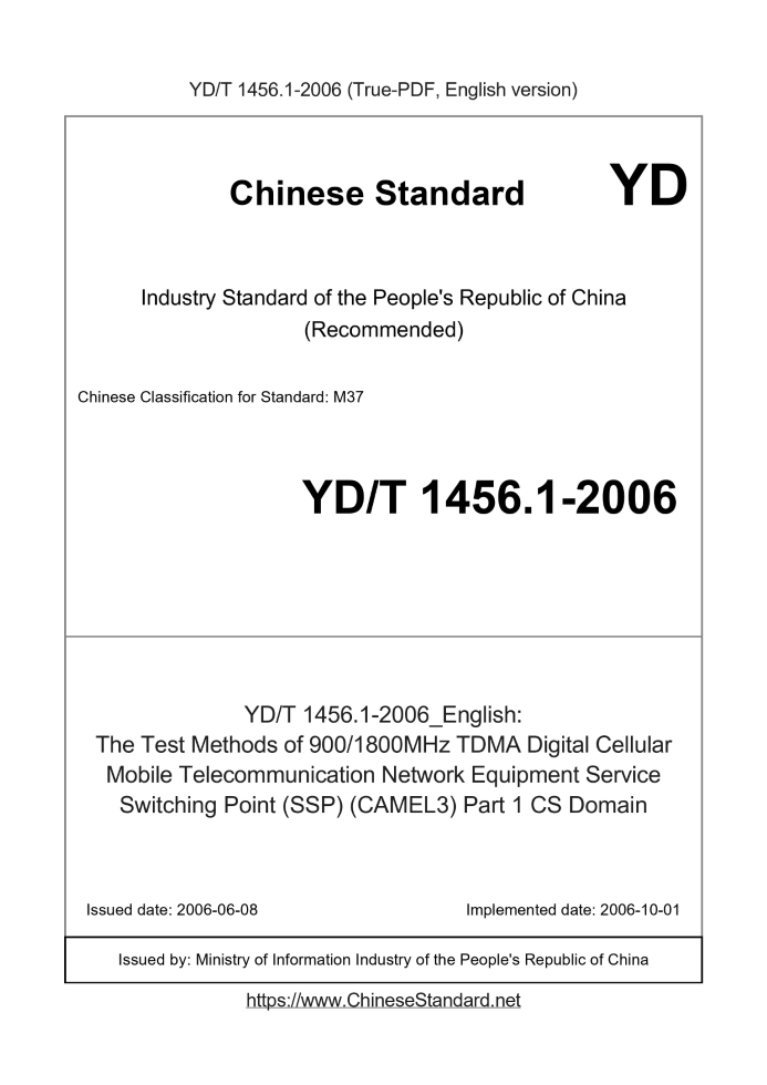 Delivery: <= 13 days. True-PDF full-copy in English will be manually translated and delivered via email. YD/T 1456.1-2006: The Test Methods of 900/1800MHz TDMA Digital Cellular Mobile Telecommunication Network Equipment Service Switching Point (SSP) (CAMEL3) Part 1 CS Domain Status: Valid
