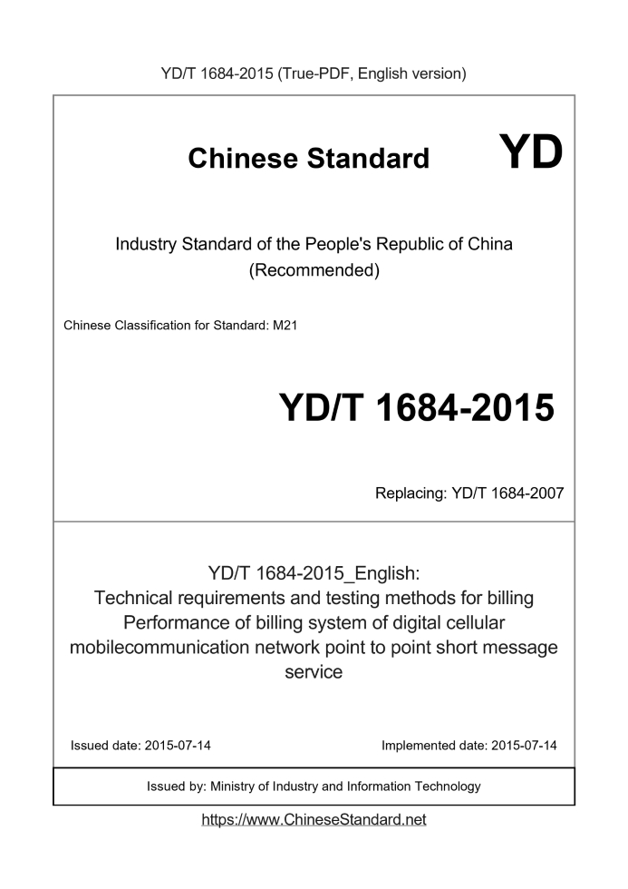 Delivery: <= 4 days. True-PDF full-copy in English will be manually translated and delivered via email. YD/T 1684-2015: Technical requirements and testing methods for billing Performance of billing system of digital cellular mobilecommunication network point to point short message service Status: Valid YD/T 1684: Historical versions