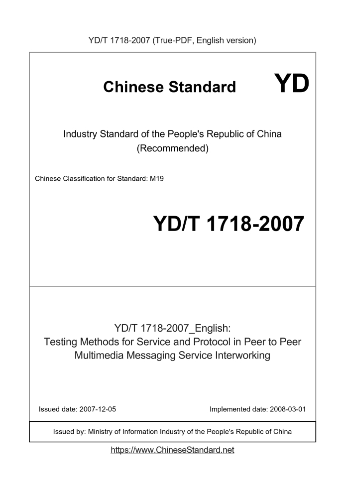 Delivery: <= 7 days. True-PDF full-copy in English will be manually translated and delivered via email. YD/T 1718-2007: Testing Methods for Service and Protocol in Peer to Peer Multimedia Messaging Service Interworking Status: Valid