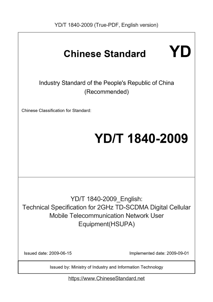 Delivery: <= 5 days. True-PDF full-copy in English will be manually translated and delivered via email. YD/T 1840-2009: Technical Specification for 2GHz TD-SCDMA Digital Cellular Mobile Telecommunication Network User Equipment(HSUPA)