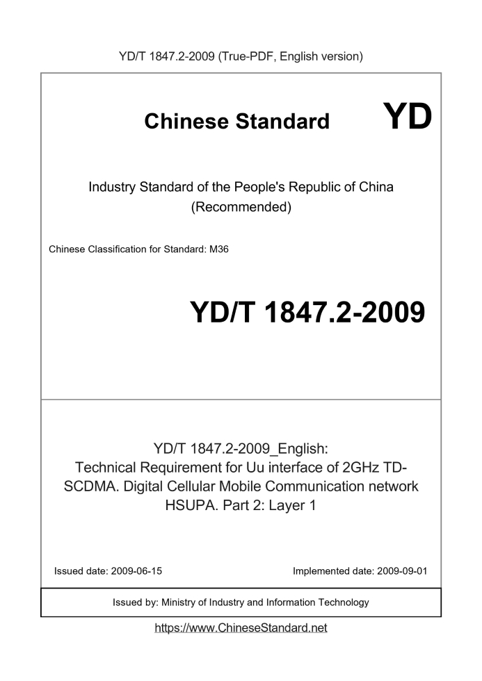 Delivery: <= 3 days. True-PDF full-copy in English will be manually translated and delivered via email. YD/T 1847.2-2009: Technical Requirement for Uu interface of 2GHz TD-SCDMA. Digital Cellular Mobile Communication network HSUPA. Part 2: Layer 1 Status: Valid