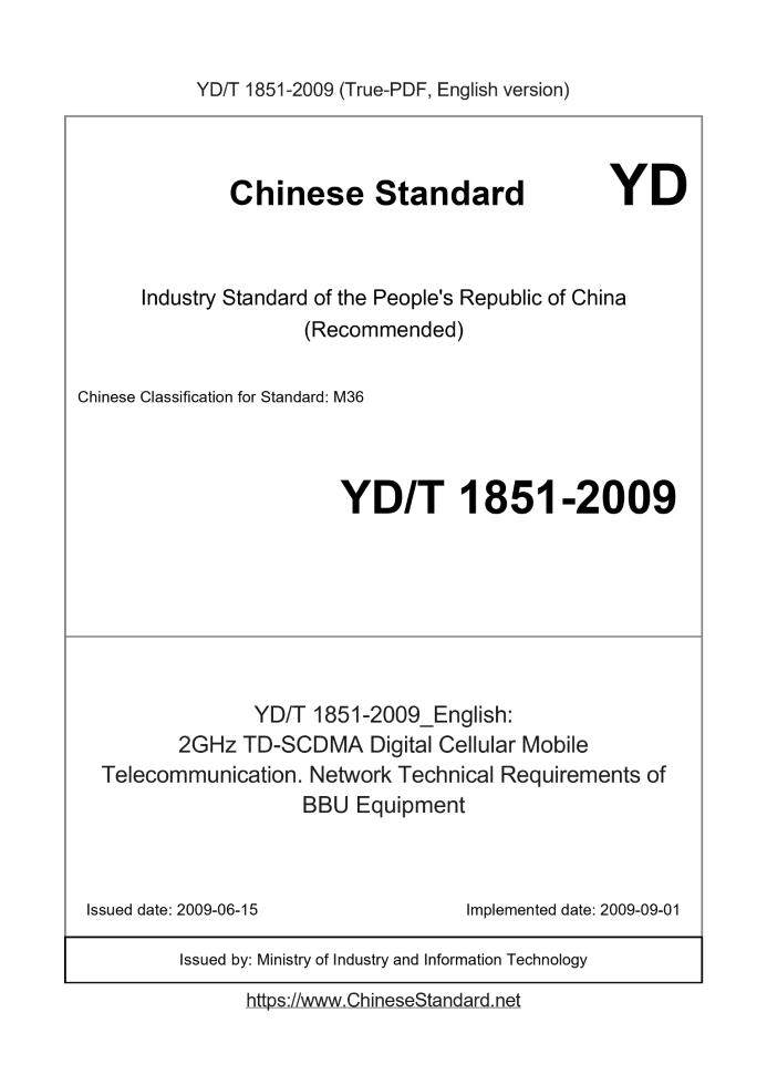 Delivery: <= 4 days. True-PDF full-copy in English will be manually translated and delivered via email. YD/T 1851-2009: 2GHz TD-SCDMA Digital Cellular Mobile Telecommunication. Network Technical Requirements of BBU Equipment
