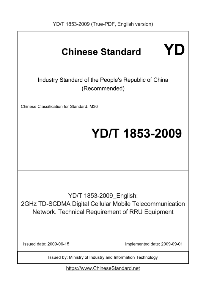 Delivery: <= 5 days. True-PDF full-copy in English will be manually translated and delivered via email. YD/T 1853-2009: 2GHz TD-SCDMA Digital Cellular Mobile Telecommunication Network. Technical Requirement of RRU Equipment Status: Valid