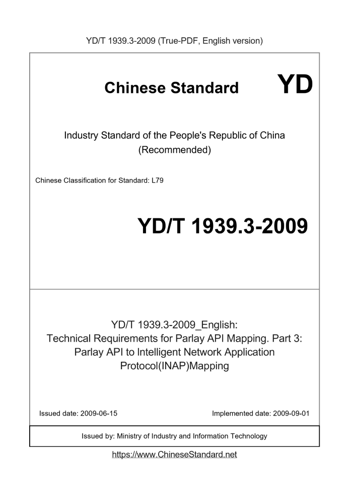Delivery: <= 10 days. True-PDF full-copy in English will be manually translated and delivered via email. YD/T 1939.3-2009: Technical Requirements for Parlay API Mapping. Part 3: Parlay API to lntelligent Network Application Protocol(INAP)Mapping