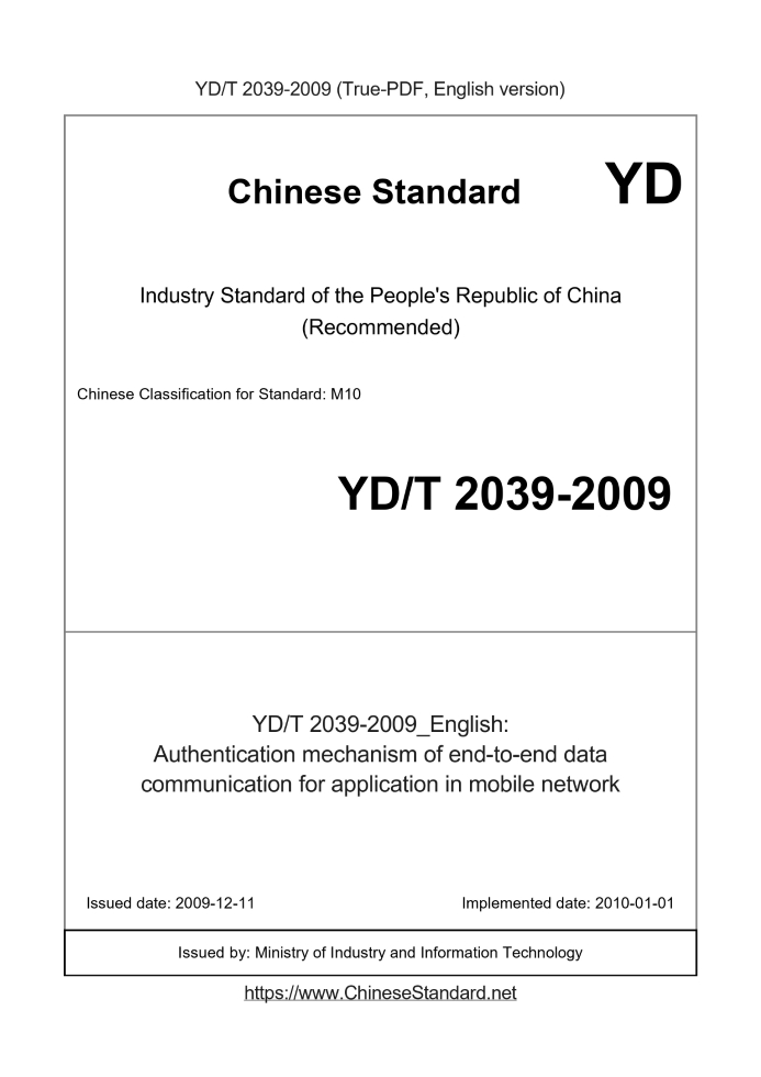 Delivery: <= 6 days. True-PDF full-copy in English will be manually translated and delivered via email. YD/T 2039-2009: Authentication mechanism of end-to-end data communication for application in mobile network Status: Valid
