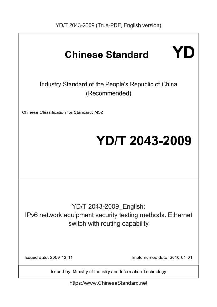 Delivery: <= 6 days. True-PDF full-copy in English will be manually translated and delivered via email. YD/T 2043-2009: IPv6 network equipment security testing methods. Ethernet switch with routing capability Status: Valid