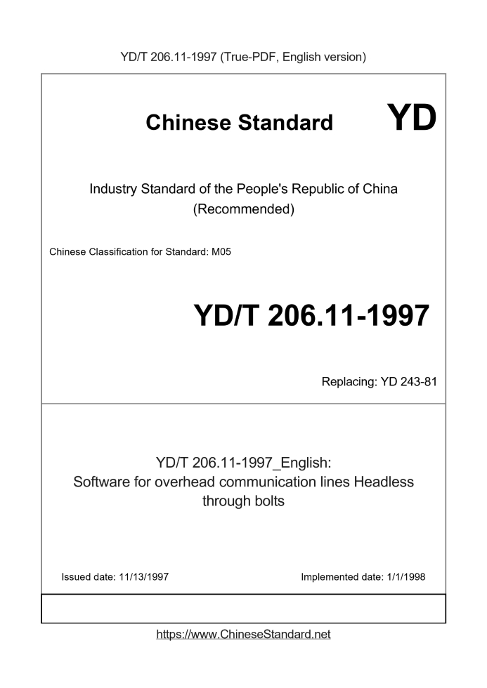 Delivery: <= 3 days. True-PDF full-copy in English will be manually translated and delivered via email. YD/T 206.11-1997: Software for overhead communication lines Headless through bolts