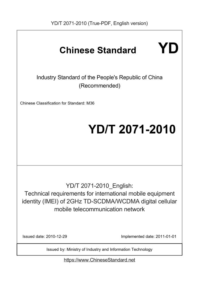 Delivery: <= 3 days. True-PDF full-copy in English will be manually translated and delivered via email. YD/T 2071-2010: Technical requirements for international mobile equipment identity (IMEI) of 2GHz TD-SCDMA/WCDMA digital cellular mobile telecommunication network Status: Valid