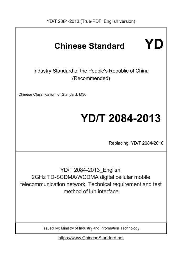 Delivery: <= 5 days. True-PDF full-copy in English will be manually translated and delivered via email. YD/T 2084-2013: 2GHz TD-SCDMA/WCDMA digital cellular mobile telecommunication network. Technical requirement and test method of luh interface Status: Valid YD/T 2084: Historical versions