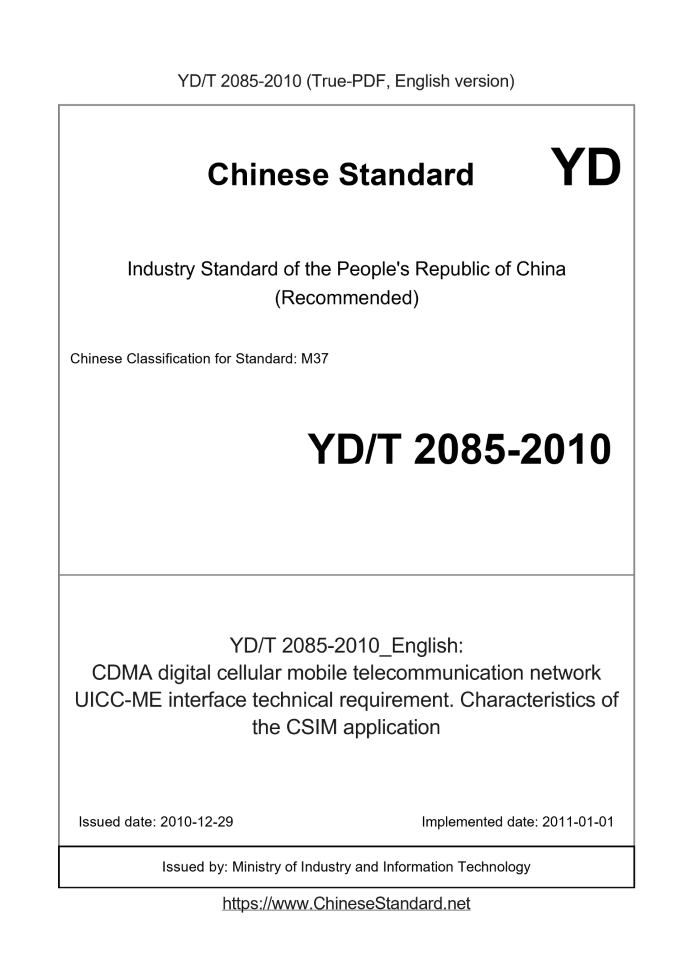 Delivery: <= 10 days. True-PDF full-copy in English will be manually translated and delivered via email. YD/T 2085-2010: CDMA digital cellular mobile telecommunication network UICC-ME interface technical requirement. Characteristics of the CSIM application Status: Valid