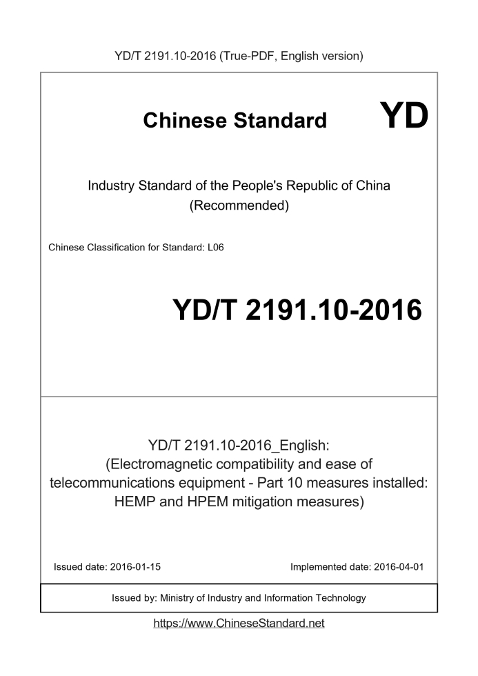 Delivery: <= 4 days. True-PDF full-copy in English will be manually translated and delivered via email. YD/T 2191.10-2016: (Electromagnetic compatibility and ease of telecommunications equipment - Part 10 measures installed: HEMP and HPEM mitigation measures) Status: Valid