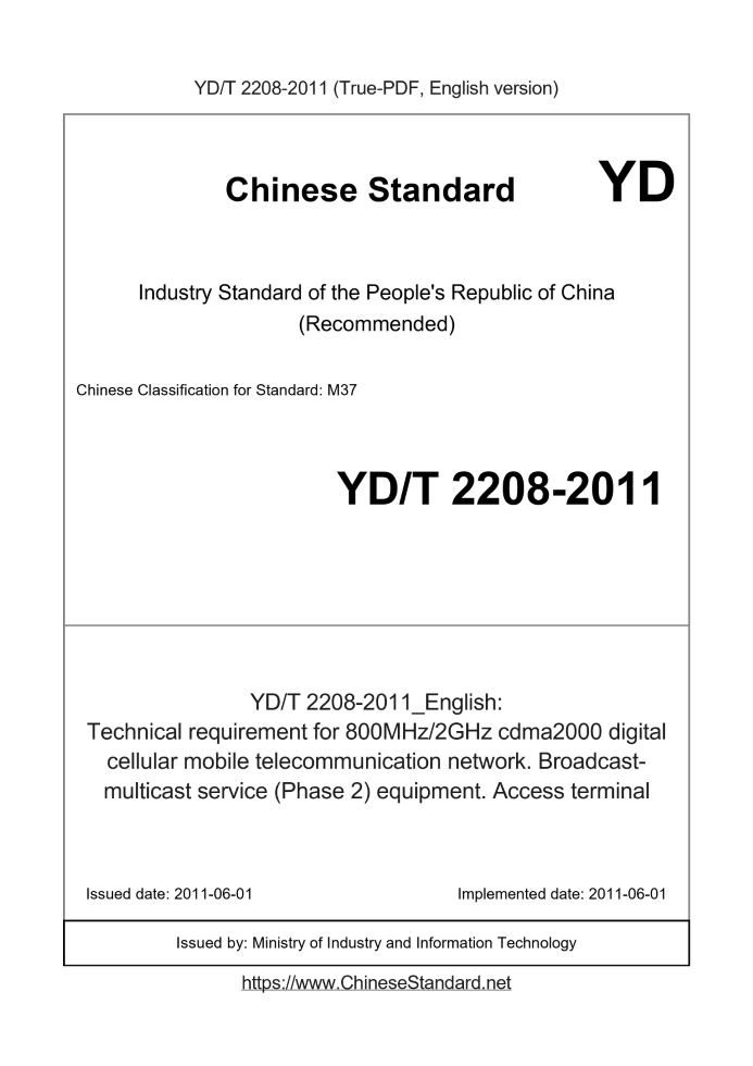 Delivery: <= 3 days. True-PDF full-copy in English will be manually translated and delivered via email. YD/T 2208-2011: Technical requirement for 800MHz/2GHz cdma2000 digital cellular mobile telecommunication network. Broadcast-multicast service (Phase 2) equipment. Access terminal Status: Valid