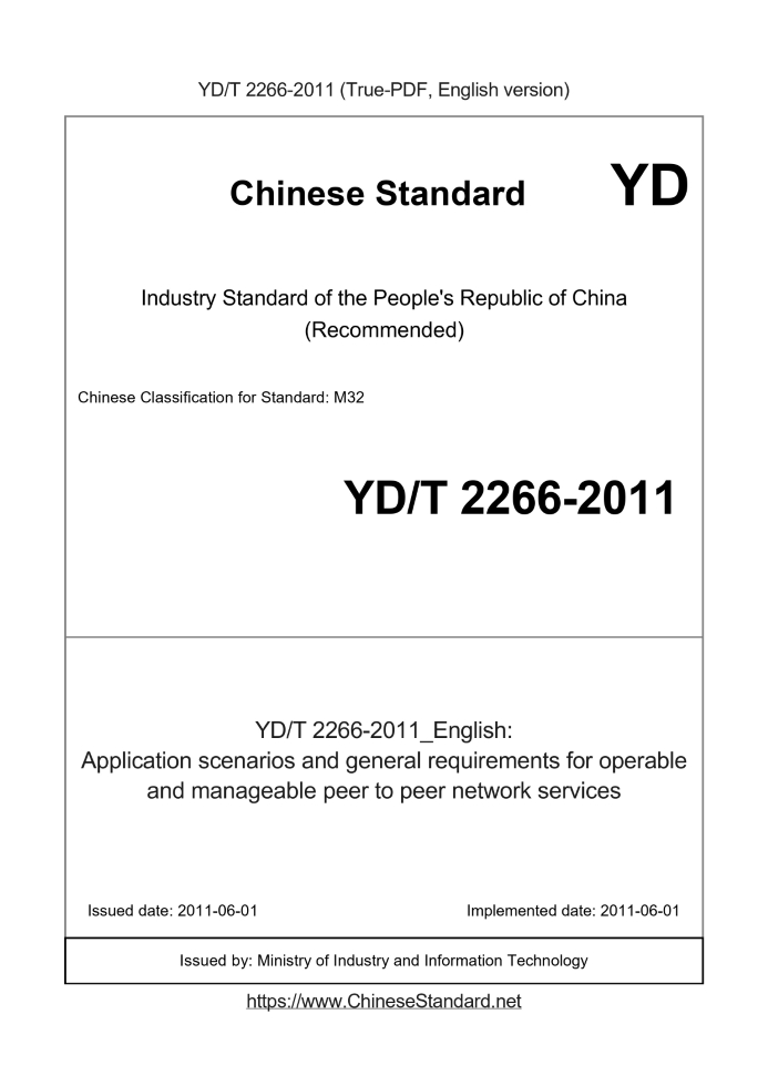 Delivery: <= 4 days. True-PDF full-copy in English will be manually translated and delivered via email. YD/T 2266-2011: Application scenarios and general requirements for operable and manageable peer to peer network services Status: Valid