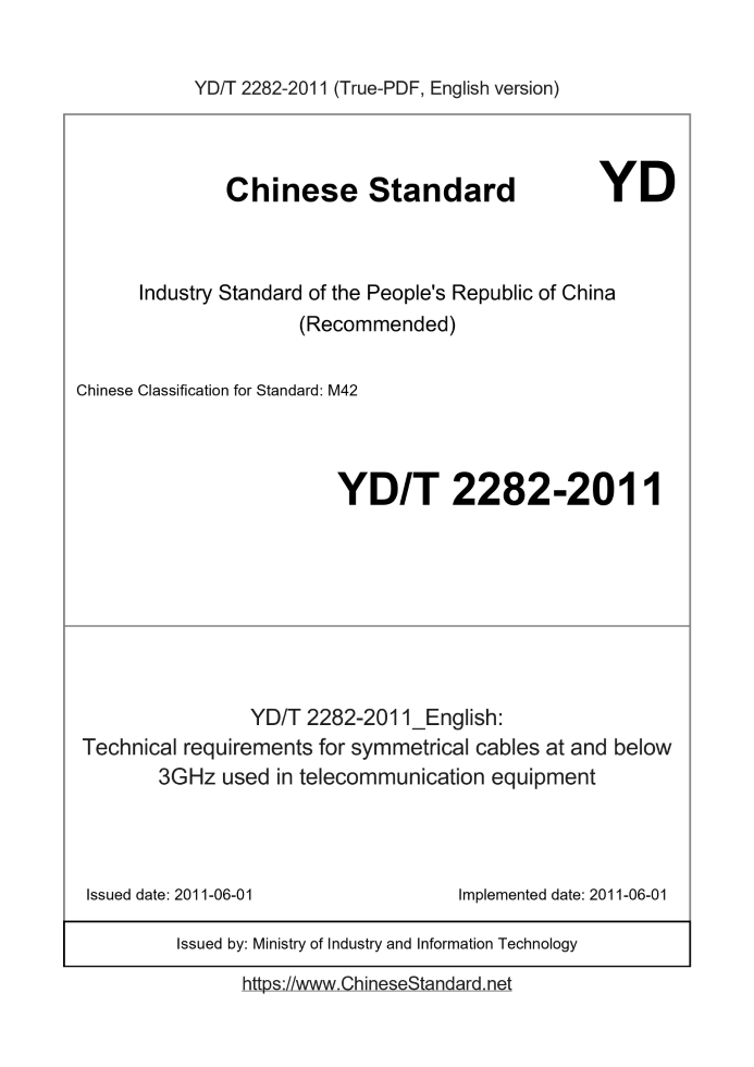 Delivery: <= 4 days. True-PDF full-copy in English will be manually translated and delivered via email. YD/T 2282-2011: Technical requirements for symmetrical cables at and below 3GHz used in telecommunication equipment Status: Valid