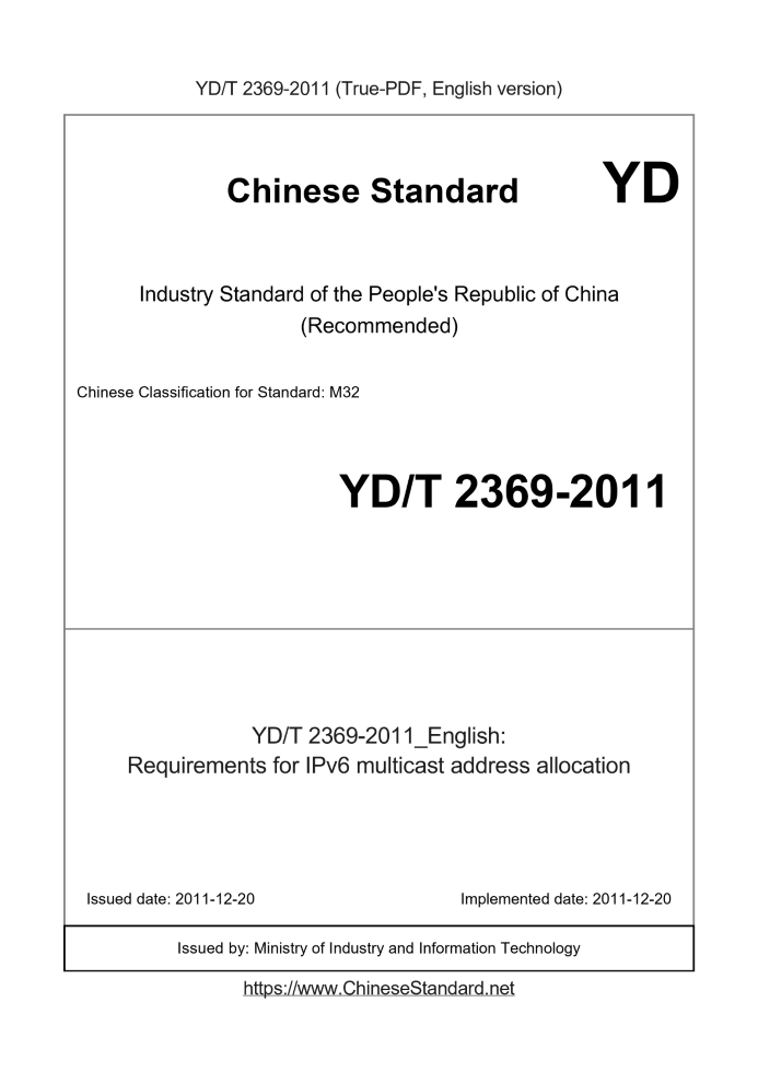 Delivery: <= 3 days. True-PDF full-copy in English will be manually translated and delivered via email. YD/T 2369-2011: Requirements for IPv6 multicast address allocation Status: Valid