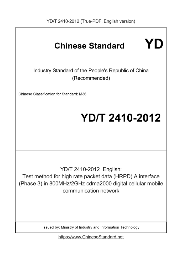 Delivery: <= 7 days. True-PDF full-copy in English will be manually translated and delivered via email. YD/T 2410-2012: Test method for high rate packet data (HRPD) A interface (Phase 3) in 800MHz/2GHz cdma2000 digital cellular mobile communication network Status: Valid