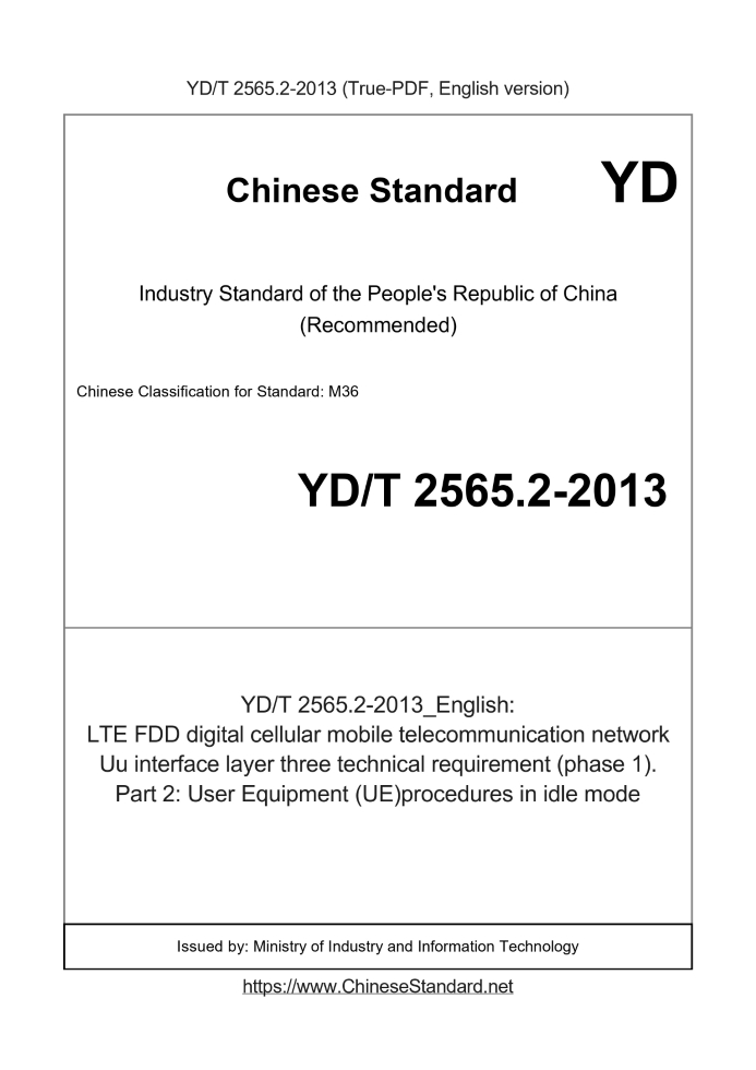 Delivery: <= 5 days. True-PDF full-copy in English will be manually translated and delivered via email. YD/T 2565.2-2013: LTE FDD digital cellular mobile telecommunication network Uu interface layer three technical requirement (phase 1). Part 2: User Equipment (UE)procedures in idle mode Status: Valid