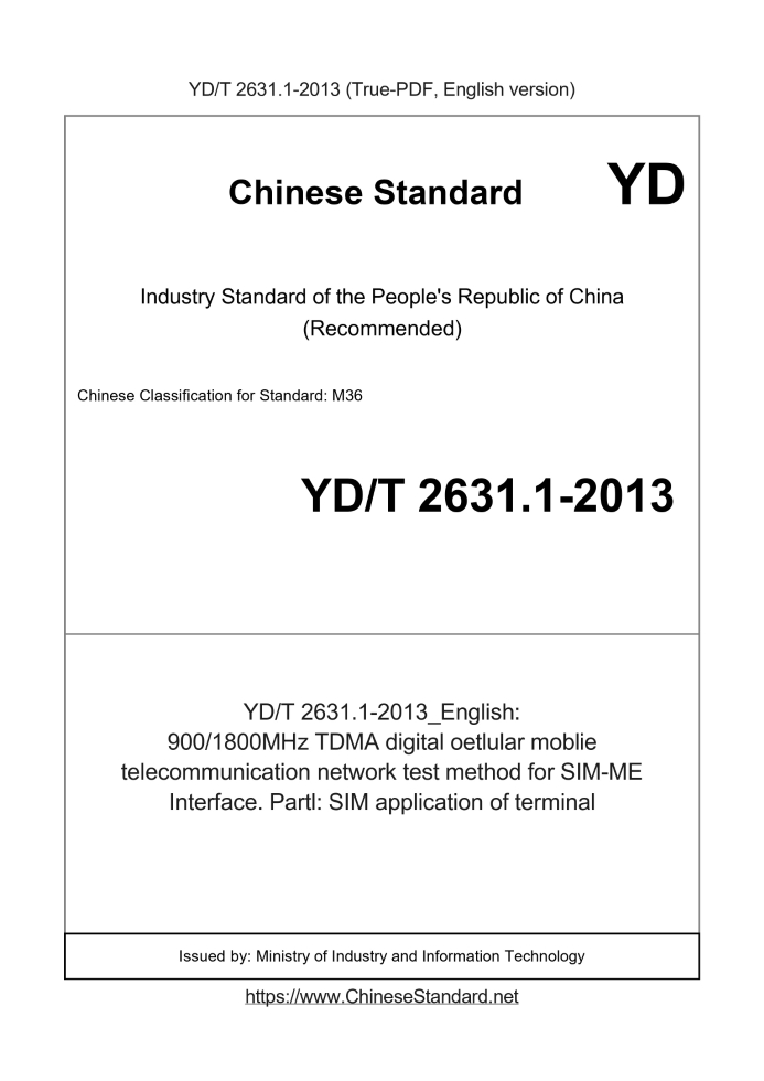 Delivery: <= 13 days. True-PDF full-copy in English will be manually translated and delivered via email. YD/T 2631.1-2013: 900/1800MHz TDMA digital oetlular moblie telecommunication network test method for SIM-ME Interface. Partl: SIM application of terminal Status: Valid