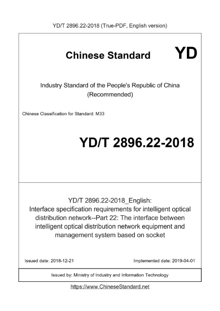 Delivery: <= 4 days. True-PDF full-copy in English will be manually translated and delivered via email. YD/T 2896.22-2018: Interface specification requirements for intelligent optical distribution network--Part 22: The interface between intelligent optical distribution network equipment and management system based on socket Status: Valid