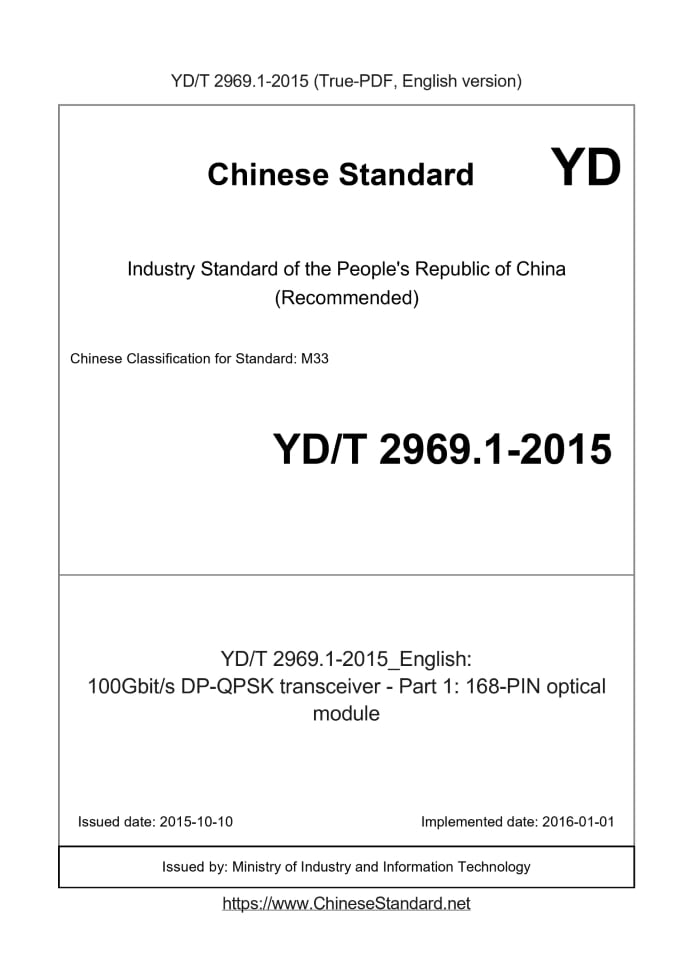 Delivery: <= 5 days. True-PDF full-copy in English will be manually translated and delivered via email. YD/T 2969.1-2015: 100Gbit/s DP-QPSK transceiver - Part 1: 168-PIN optical module Status: Valid