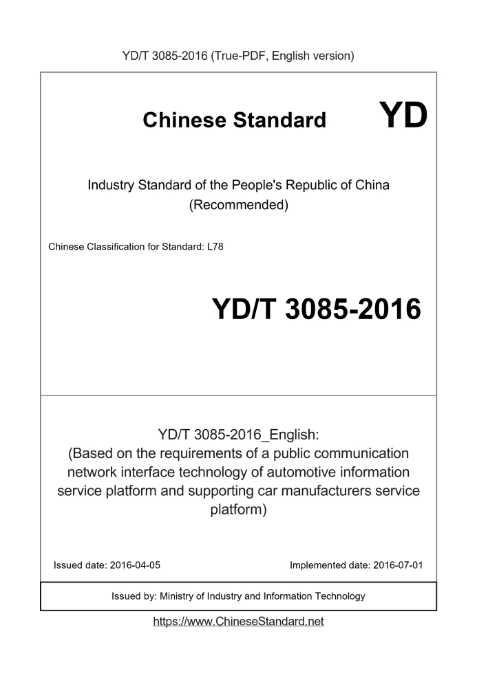 Delivery: <= 4 days. True-PDF full-copy in English will be manually translated and delivered via email. YD/T 3085-2016: (Based on the requirements of a public communication network interface technology of automotive information service platform and supporting car manufacturers service platform) Status: Valid