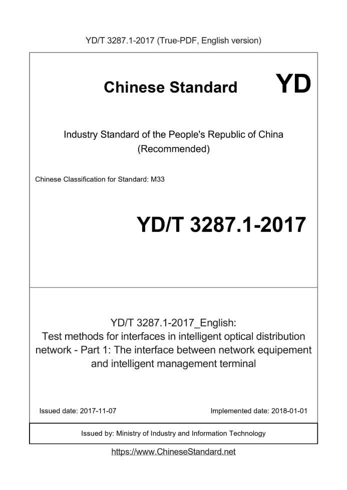 Delivery: <= 3 days. True-PDF full-copy in English will be manually translated and delivered via email. YD/T 3287.1-2017: Test methods for interfaces in intelligent optical distribution network - Part 1: The interface between network equipement and intelligent management terminal Status: Valid