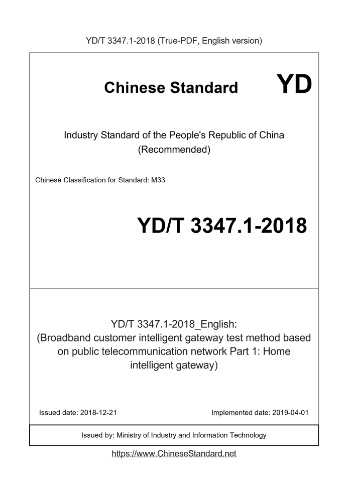 Delivery: <= 8 days. True-PDF full-copy in English will be manually translated and delivered via email. YD/T 3347.1-2018: (Broadband customer intelligent gateway test method based on public telecommunication network Part 1: Home intelligent gateway) Status: Valid