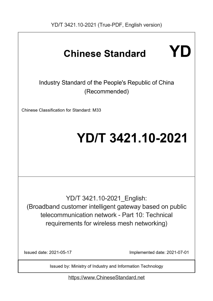 Delivery: <= 3 days. True-PDF full-copy in English will be manually translated and delivered via email. YD/T 3421.10-2021: (Broadband customer intelligent gateway based on public telecommunication network - Part 10: Technical requirements for wireless mesh networking) Status: Valid