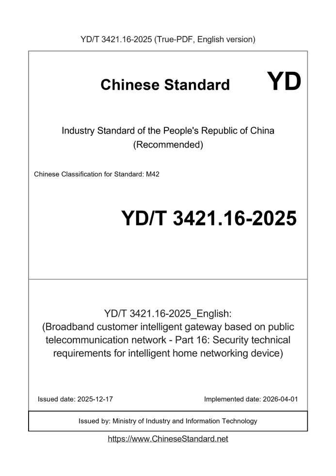 | YD/T 3421.16-2025 | English | RFQ | ASK | 3 days [Need to translate] | (Broadband customer intelligent gateway based on public telecommunication network - Part 16: Security technical requirements for intelligent home networking device) |