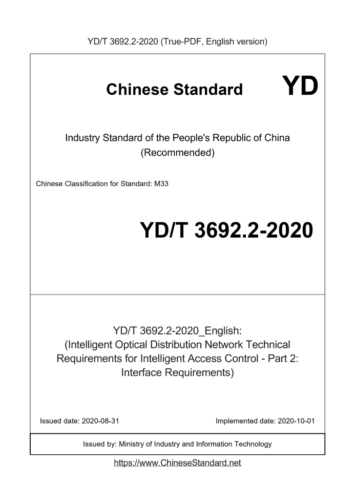 | YD/T 3692.2-2020 English PDFUS$1439.00 ยท In stock Delivery: <= 8 days. True-PDF full-copy in English will be manually translated and delivered via email. YD/T 3692.2-2020: (Intelligent Optical Distribution Network Technical Requirements for Intelligent Access Control - Part 2: Interface Requirements) Status: Valid
