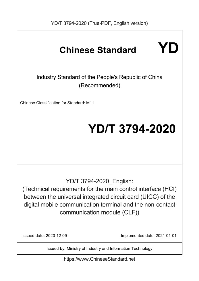 | YD/T 3794-2020 English PDFUS$999.00 ยท In stock Delivery: <= 7 days. True-PDF full-copy in English will be manually translated and delivered via email. YD/T 3794-2020: (Technical requirements for the main control interface (HCI) between the universal integrated circuit card (UICC) of the digital mobile communication terminal and the non-contact communication module (CLF)) Status: Valid