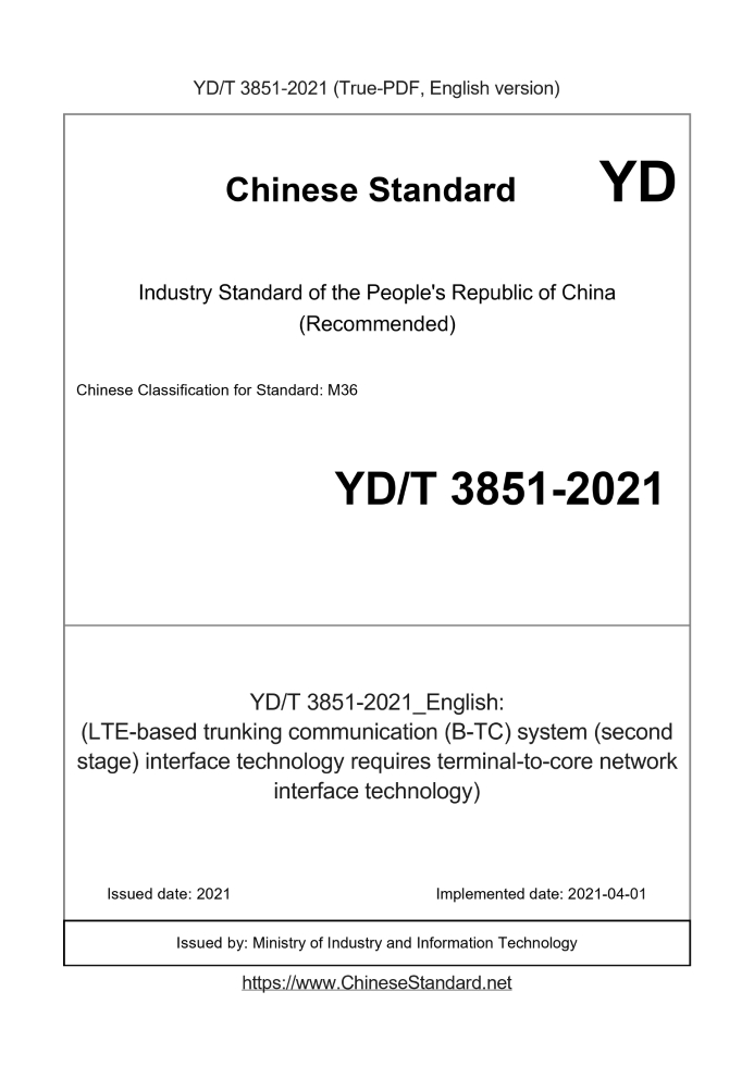 Basic dataStandard ID: YD/T 3851-2021 (YD/T3851-2021)Description (Translated English): (LTE-based trunking communication (B-TC) system (second stage) interface technology requires terminal-to-core network interface technology) Sector / Industry: Telecommunication Industry Standard (Recommended) Classification of Chinese Standard: M36 Classification of International Standard: 33.060 Date of Issue: 2021 Date of Implementation: 2021-04-01 Regulation (derived from): Ministry of Industry and Information Technology Announcement No. 6 of 2021 Issuing agency(ies): Ministry of Industry and Information Technology Summary: This standard specifies the technical requirements for the terminal to cluster core network interface of the Broadband Trunking Communication (B-TrunC) system (second phase) based on LTE technology, including the interface model, TSM state machine, EMM cluster enhancement, TSM signaling process, NAS signaling message format, NAS signaling unit, NAS signaling message transmission, timer, etc. This standard applies to terminals and cluster core network equipment of the Broadband Trunking Communication (B-TrunC) system (second phase) based on LTE technology. Tips & Frequently Asked Questions:Question 1: How long will the true-PDF of YD/T 3851-2021_English be delivered?Answer: Upon your order, we will start to translate YD/T 3851-2021_English as soon as possible, and keep you informed of the progress. The lead time is typically 1 ~ 3 working days. The lengthier the document the longer the lead time.Question 2: Can I share the purchased PDF of YD/T 3851-2021_English with my colleagues?Answer: Yes. The purchased PDF of YD/T 3851-2021_English will be deemed to be sold to your employer/organization who actually pays for it, including your colleagues and your employer's intranet.Question 3: Does the price include tax/VAT?Answer: Yes. Our tax invoice, downloaded/delivered in 9 seconds, includes all tax/VAT and complies with 100+ countries' tax regulations (tax exempted in 100+ countries) -- See Avoidance of Double Taxation Agreements (DTAs): List of DTAs signed between Singapore and 100+ countriesQuestion 4: Do you accept my currency other than USD?Answer: Yes. If you need your currency to be printed on the invoice, please write an email to Sales@ChineseStandard.net. In 2 working-hours, we will create a special link for you to pay in any currencies. Otherwise, follow the normal steps: Add to Cart -- Checkout -- Select your currency to pay. |