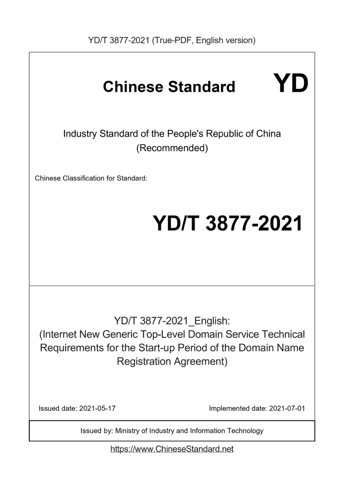 | YD/T 3877-2021 English PDFUS$559.00 ยท In stock Delivery: <= 5 days. True-PDF full-copy in English will be manually translated and delivered via email. YD/T 3877-2021: (Internet New Generic Top-Level Domain Service Technical Requirements for the Start-up Period of the Domain Name Registration Agreement) Status: Valid