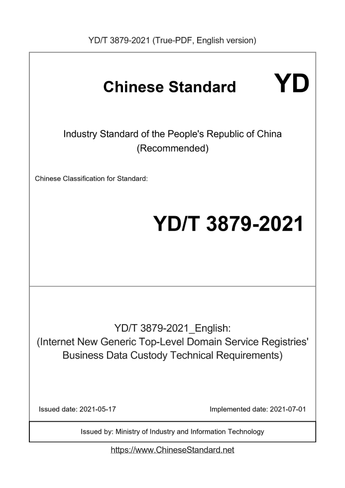 | YD/T 3879-2021 English PDFUS$369.00 ยท In stock Delivery: <= 4 days. True-PDF full-copy in English will be manually translated and delivered via email. YD/T 3879-2021: (Internet New Generic Top-Level Domain Service Registries' Business Data Custody Technical Requirements) Status: Valid